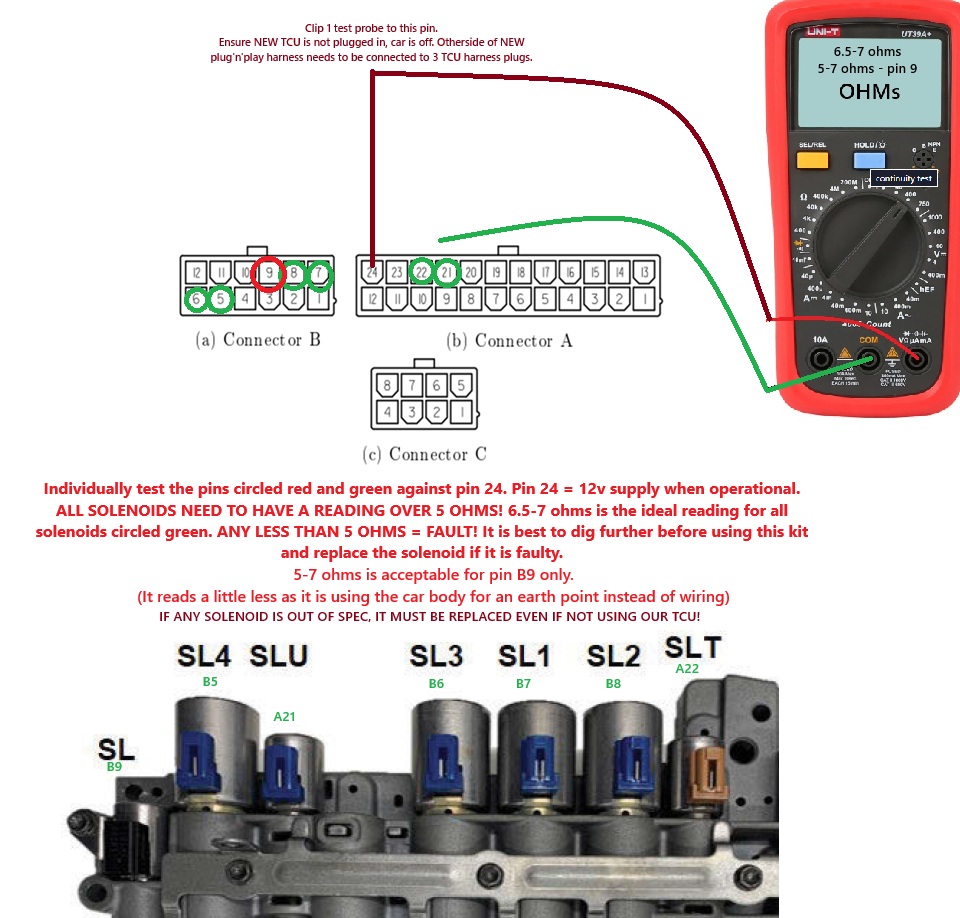 A little bit of extra time here can give you vital information about your solenoid health! It is recommended you perform this check on all the solenoid wires at the NEW TCU controller to ensure your valve body will operate correctly. Even if you do not use this kit, this check can be very useful for diagnosis and general health information about your valve body.